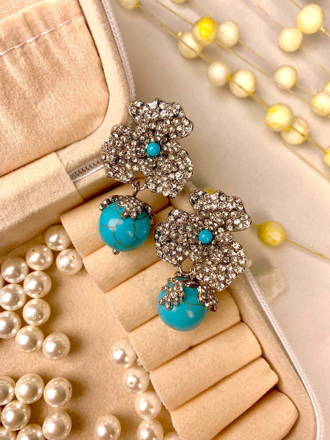The Azure Bloom earrings capture the freshness of turquoise with a radiant floral arrangement. Surrounded...