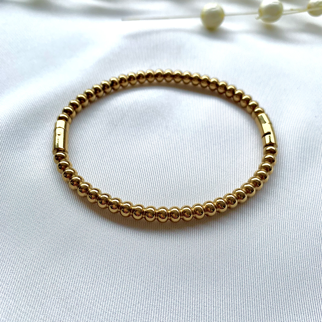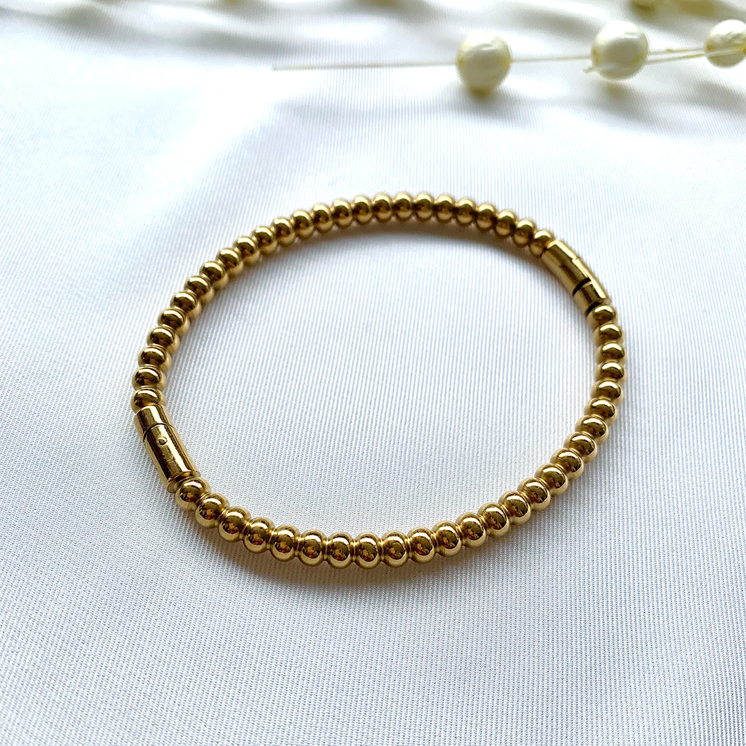 The Arden Bead Bracelet is crafted with polished golden beads that shine with a gentle glow. Its clean and minimal design makes it perfect for daily wear — easy to style on its own for a classic look or stack with other pieces for added elegance.