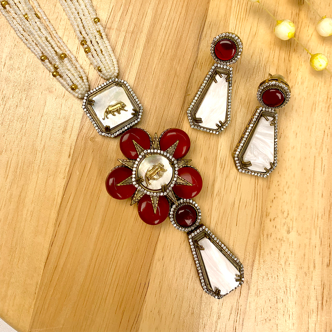 The Aurelia Mala Set is designed with layered pearl strands, enhanced with golden bead accents and bold red stone highlights. At its center, the intricate golden animal motifs bring a touch of heritage artistry, while the polished design ensures a modern, statement look. Paired with matching earrings, this mala is crafted for timeless elegance.