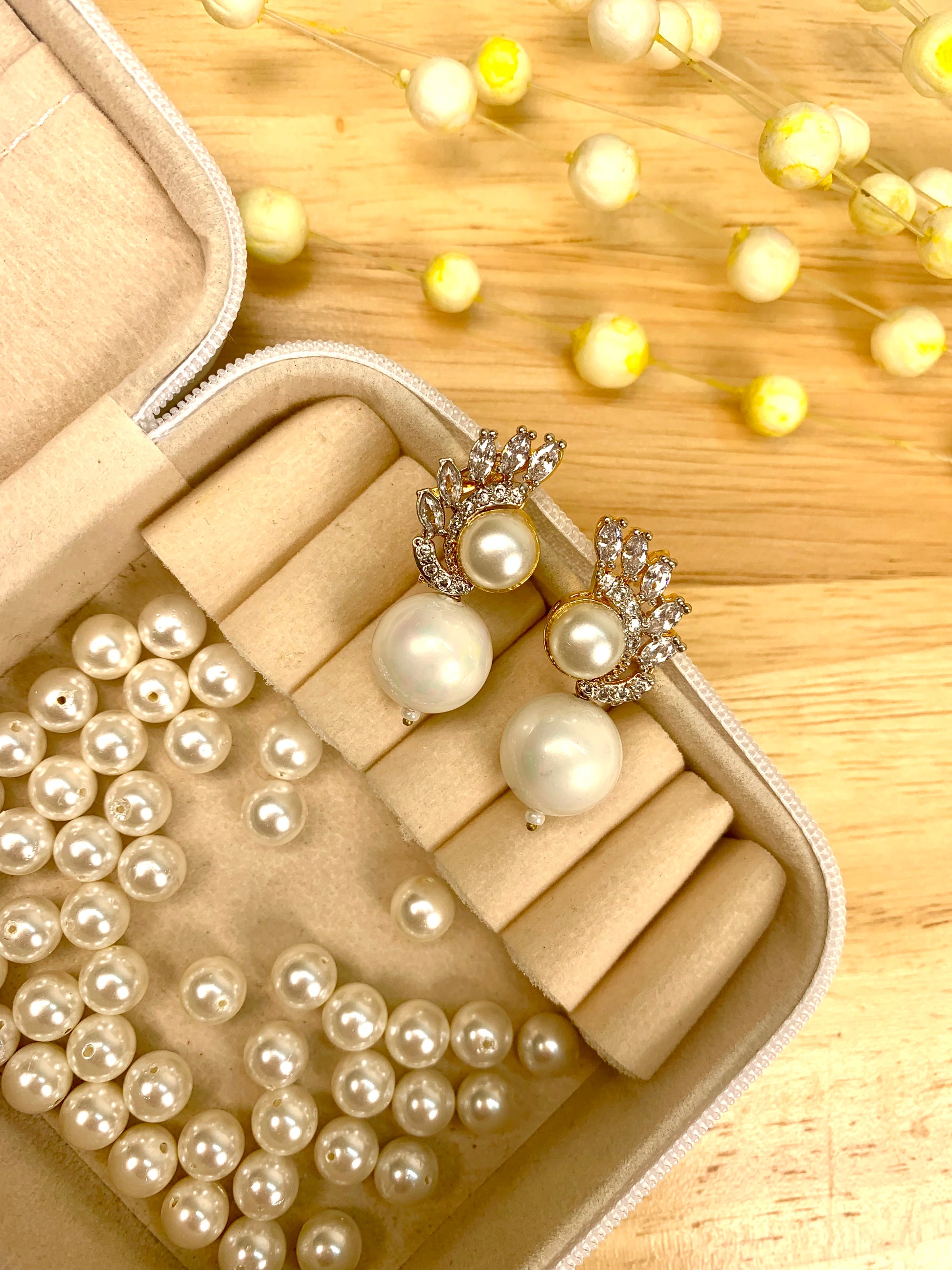 The Celestia Pearl Drops feature a pearl stud crowned with a crystal flourish, finished with a luminous pearl drop. Designed to blend royal charm with modern elegance, they’re perfect for weddings, festive occasions, and sophisticated evenings.