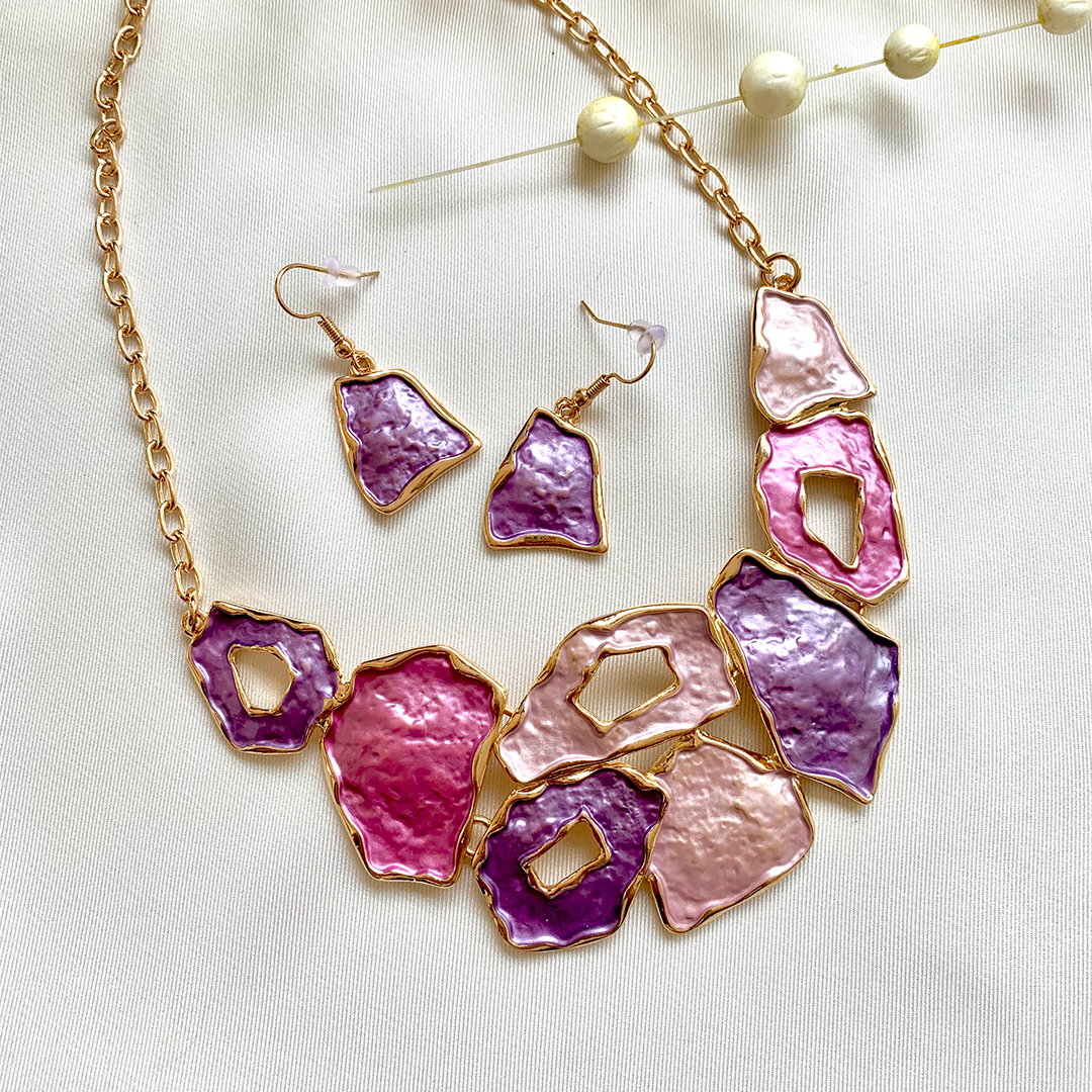 The Elara Necklace Set is crafted with a polished gold chain and paired with a striking arrangement of abstract stones in rich purple, pink, and lilac shades. Each piece shines with a textured finish that creates a bold, artistic look, making it the perfect statement for special occasions.