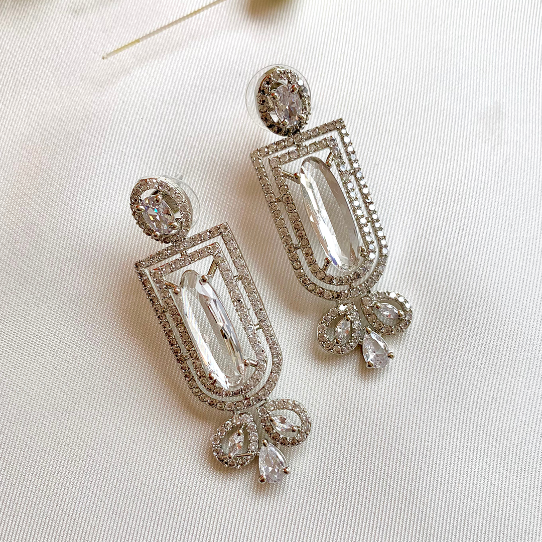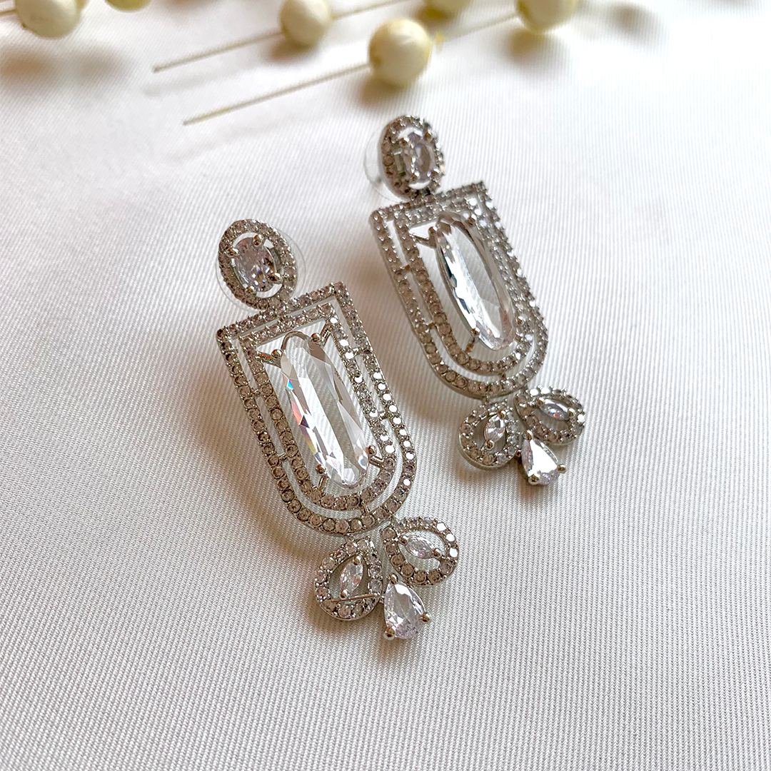 The Elaris Earrings feature a striking elongated crystal centerpiece, set within a finely detailed frame and finished with delicate pear-cut accents. Their sleek yet graceful design makes them the perfect choice for weddings, festive evenings, or sophisticated celebrations.