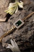 The Emerald Bracelet is a true embodiment of timeless luxury. Featuring a vivid green emerald-cut stone encased in a border of sparkling cubic zirconia, this piece brings sophistication and elegance to any look. The gold-plated chain has a sleek, polished finish, offering both durability and refined style.