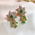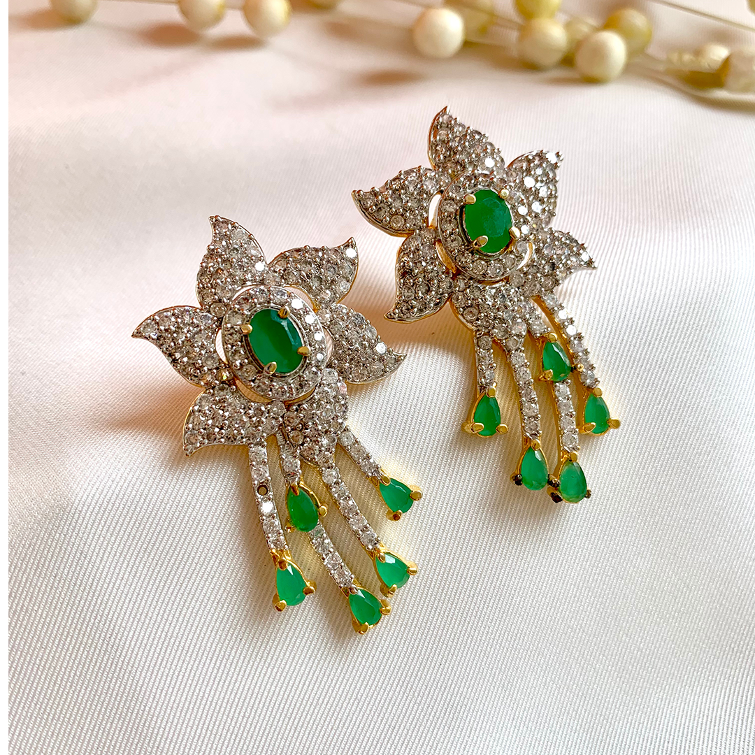 The Florenza Drops feature a crystal-encrusted floral design, centered with a vivid green gemstone and finished with cascading green drops. A radiant pair that combines elegance with a touch of nature’s charm, perfect for festive evenings and special occasions.