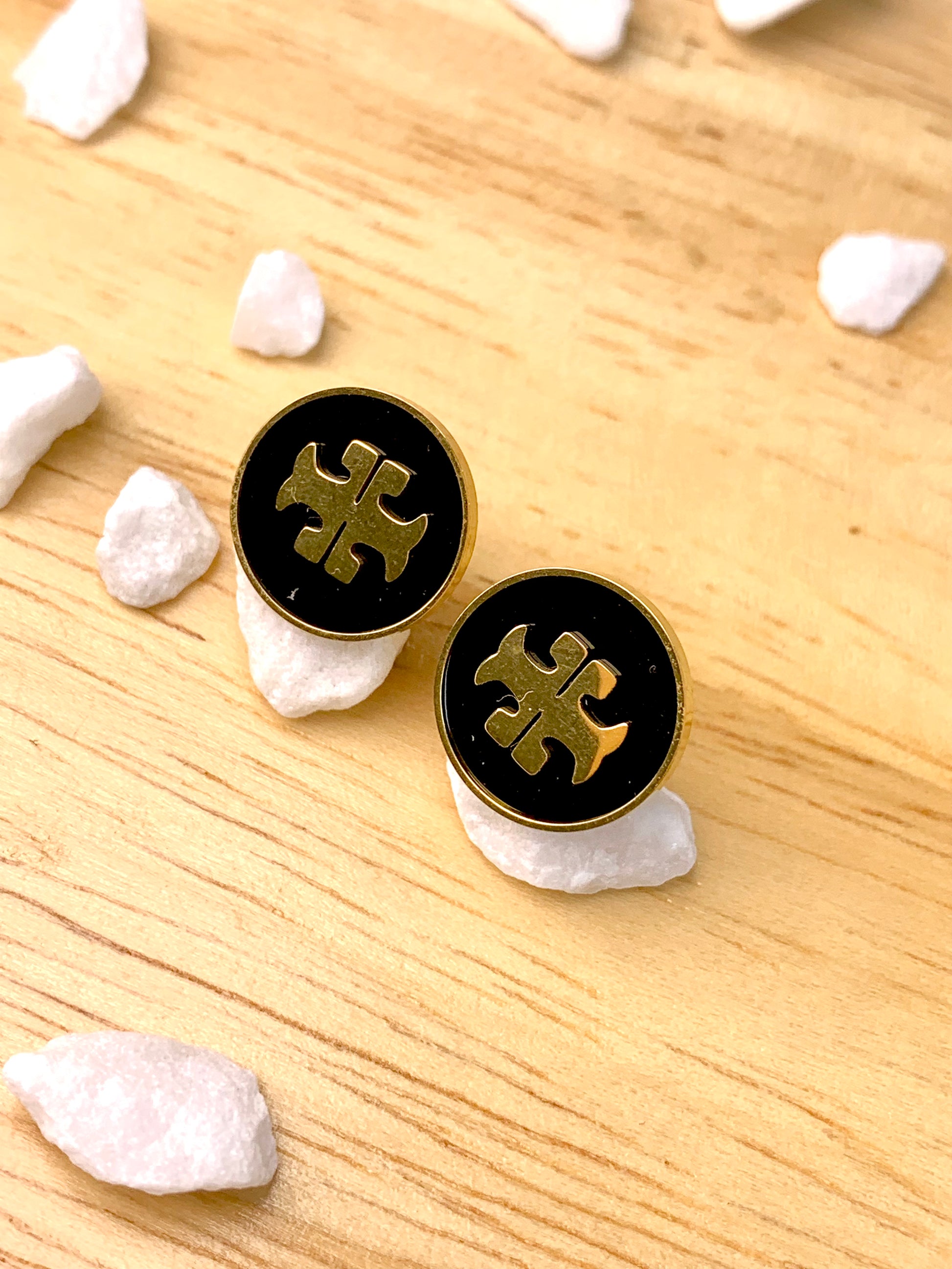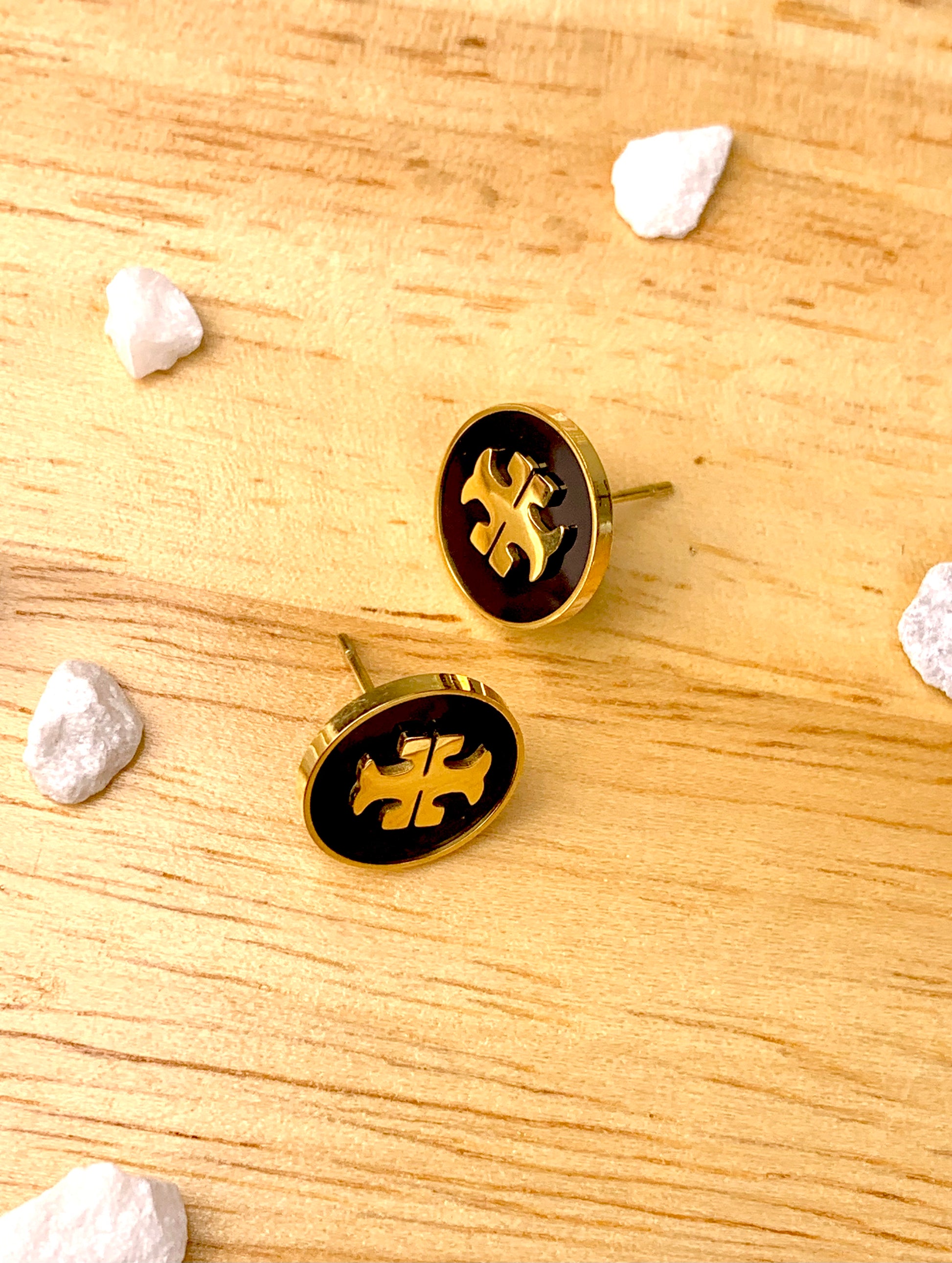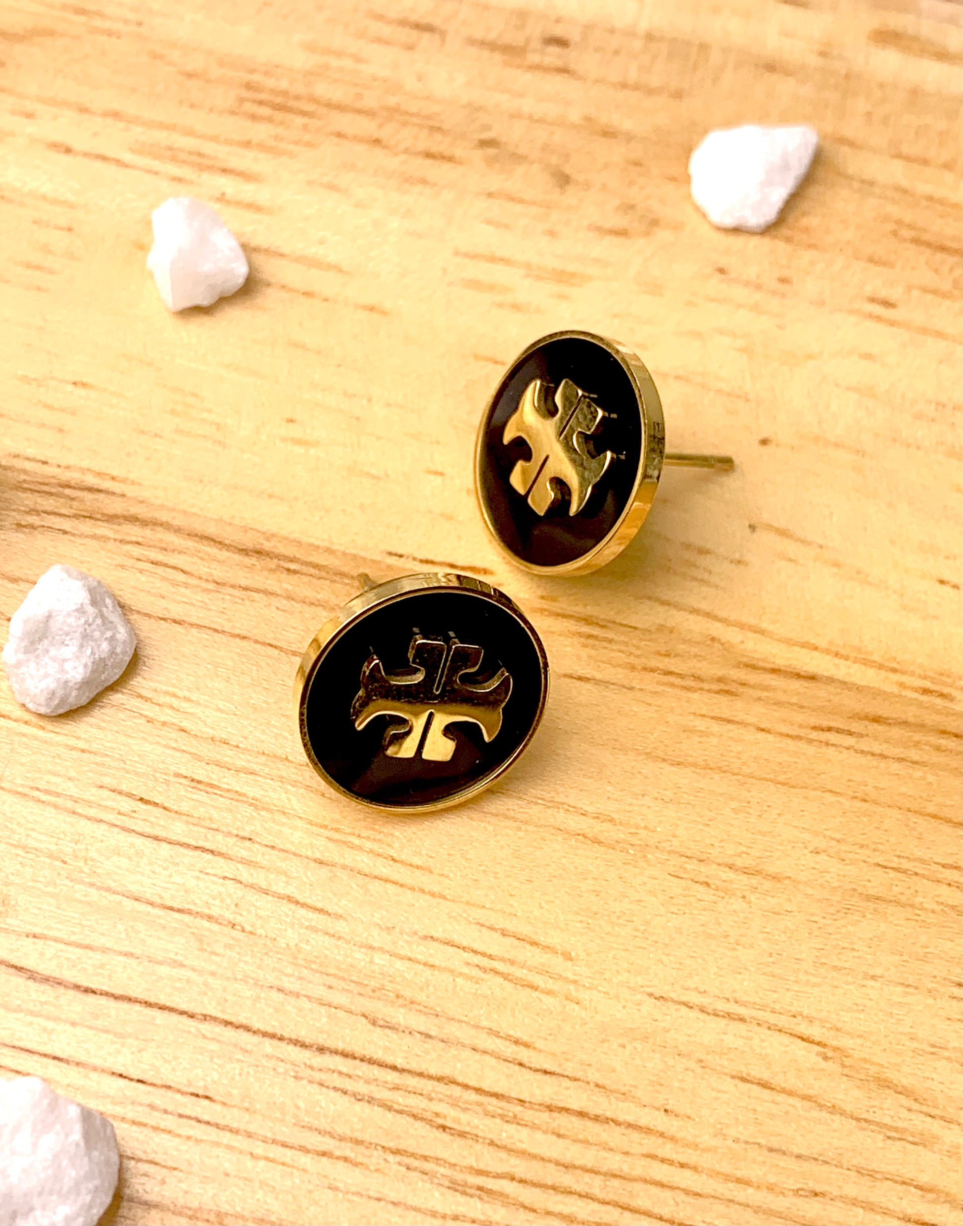 The Imperial Round Studs feature a golden emblem motif set within a bold black enamel circle, offering a refined and powerful finish. Designed for those who appreciate timeless elegance with a statement edge.