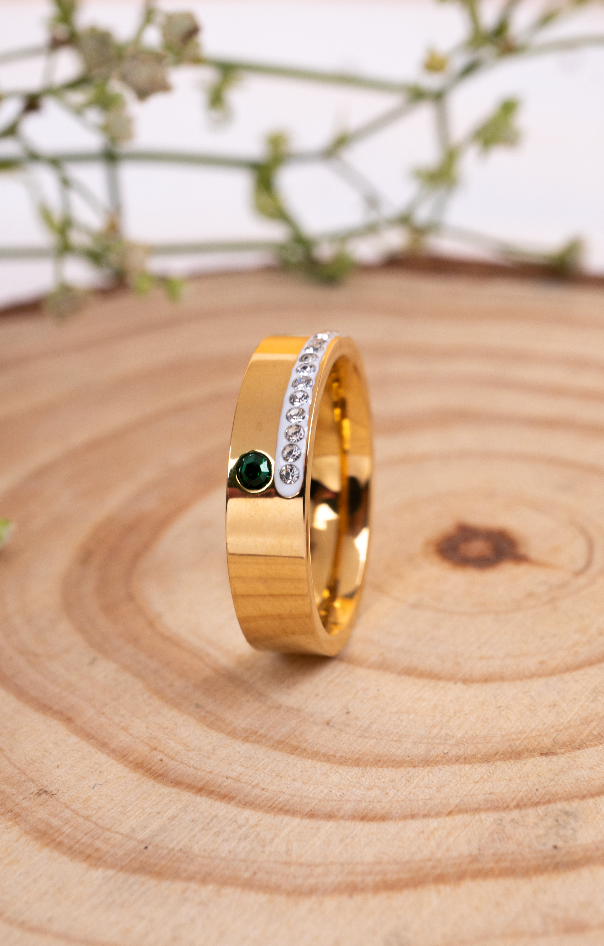The Lina Ring blends classic sophistication with a contemporary twist. Crafted from premium stainless steel and plated in radiant 18K gold, it features a sleek band accented by a row of sparkling cubic zirconia and a single striking green gemstone for a pop of color.