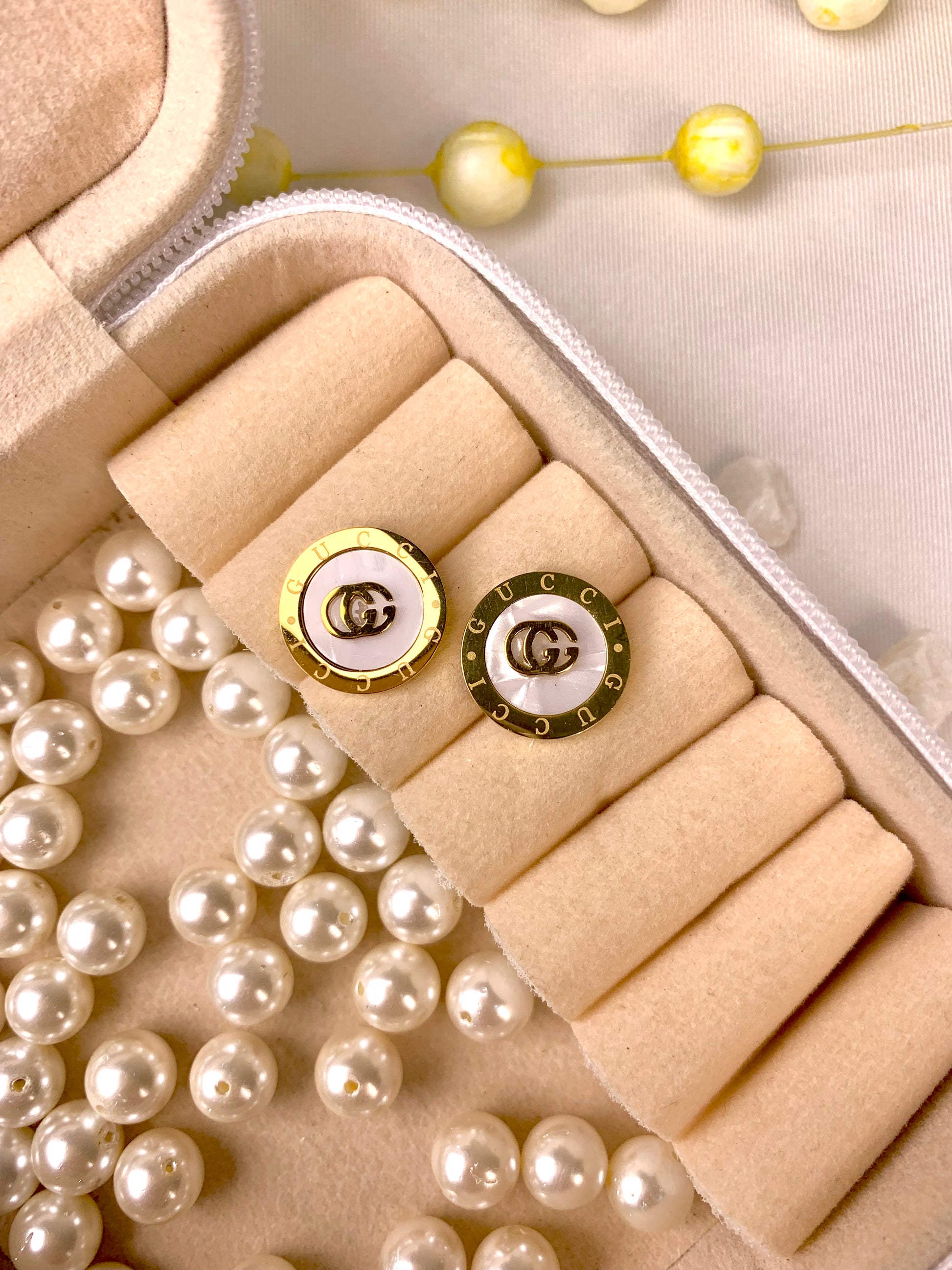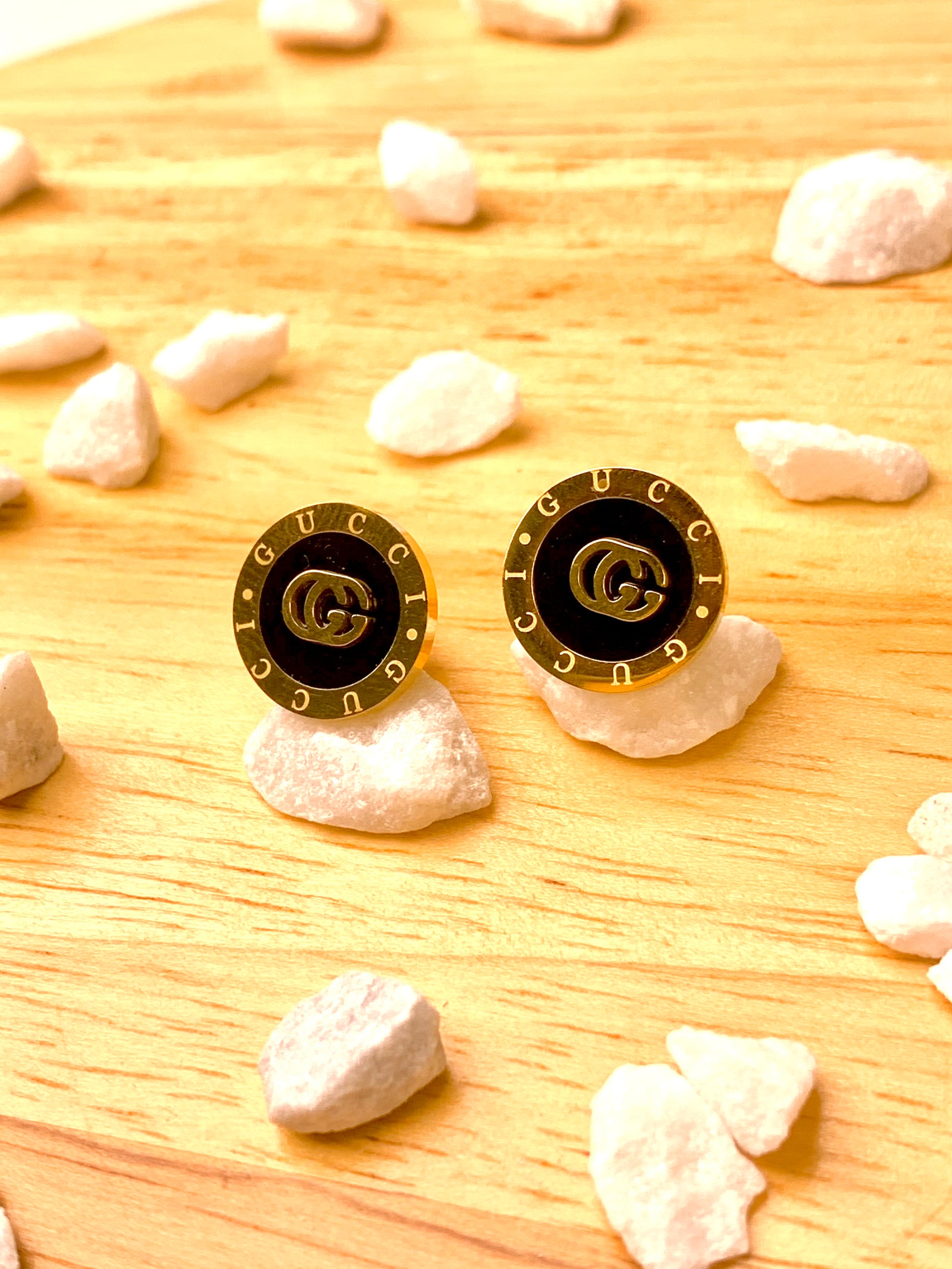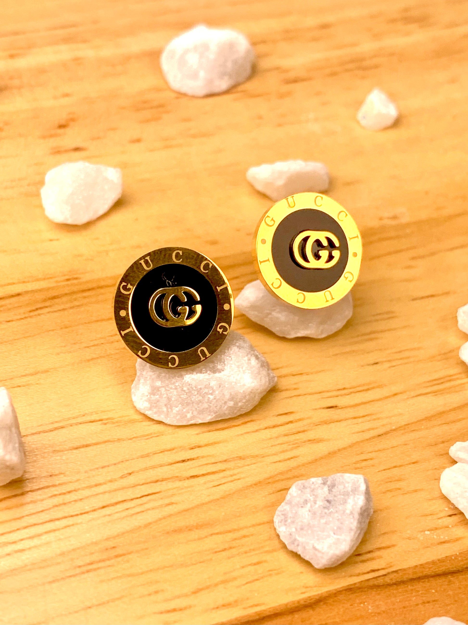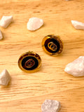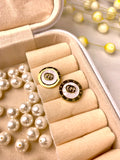 The Luxe Crest Studs bring a refined monogram-inspired design, surrounded by a polished gold-and-black border. A modern emblem of luxury for everyday sophistication.