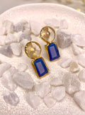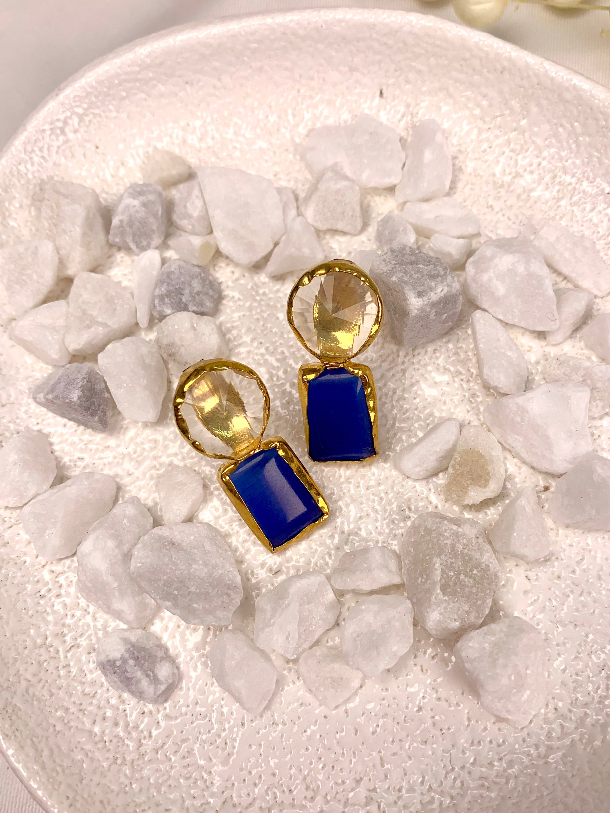 The Lyanna Duo Drops feature a faceted champagne-toned round stone paired with a striking rectangular blue stone, set in a refined golden frame. Their clean lines and bold color contrast make them a standout accessory for both everyday elegance and evening charm.