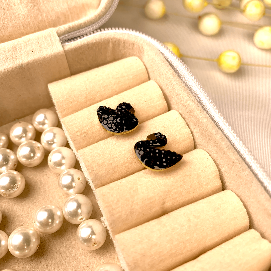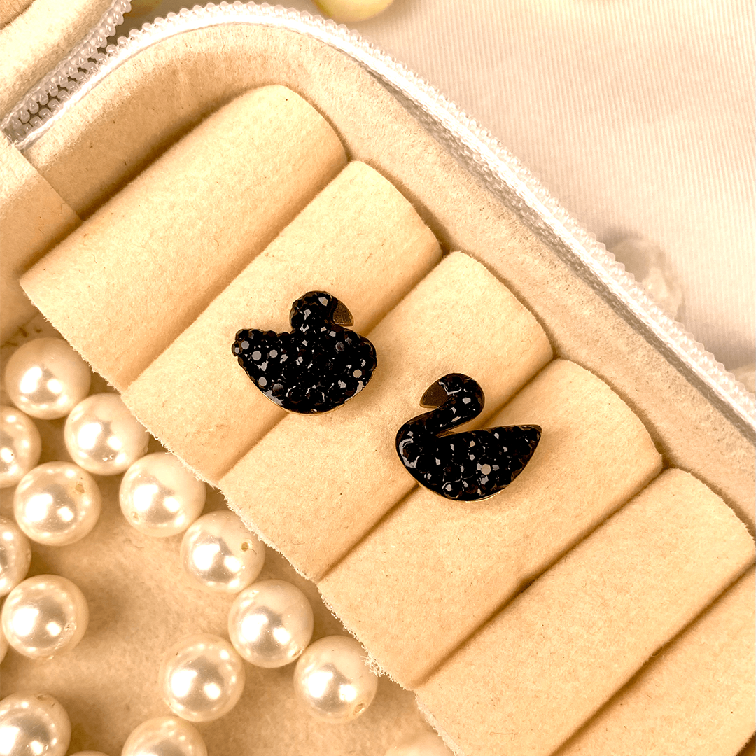 The Midnight Swans earrings feature graceful swan silhouettes adorned with sparkling black crystals — a symbol of elegance and mystery.