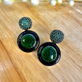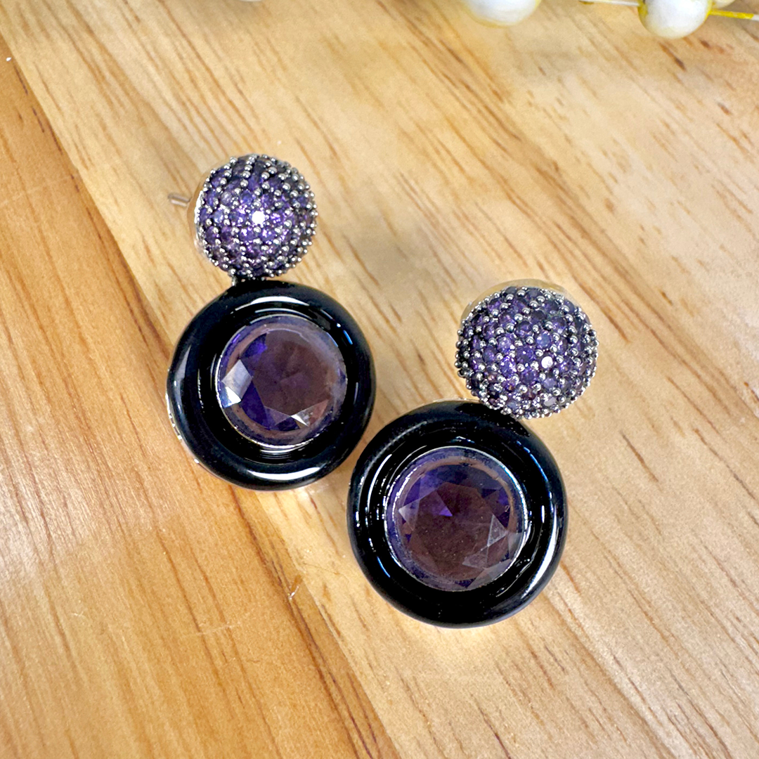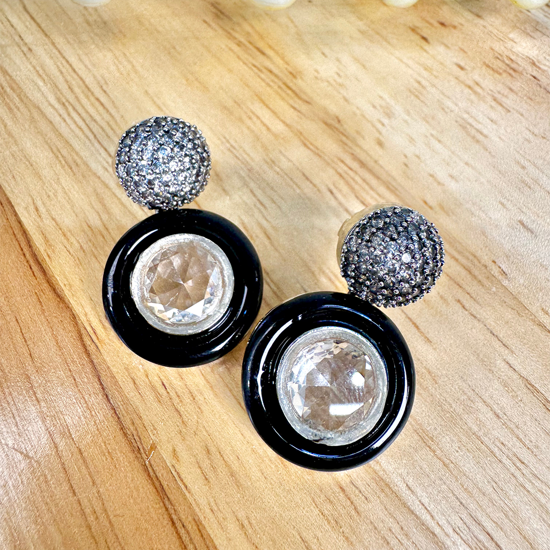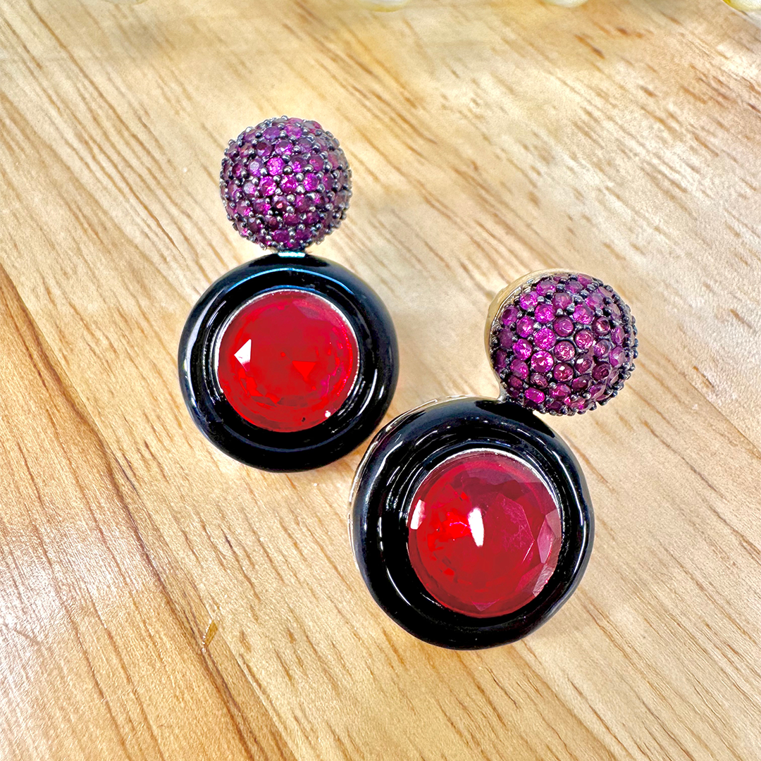 The Orbis Statement Earrings feature a pavé-set top sphere paired with a bold round gemstone framed in sleek black enamel. A contemporary design that makes a strong impression, perfect for both evening looks and standout day styling.
