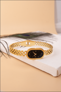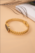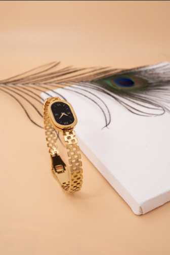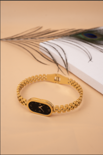 The Quartz Bracelet is a jewelry piece designed in a timepiece-inspired style, but it does not function as a watch. Featuring a sleek oval face with Roman numeral detailing, it’s crafted from premium stainless steel and plated in radiant 18K gold for a luxurious finish.
