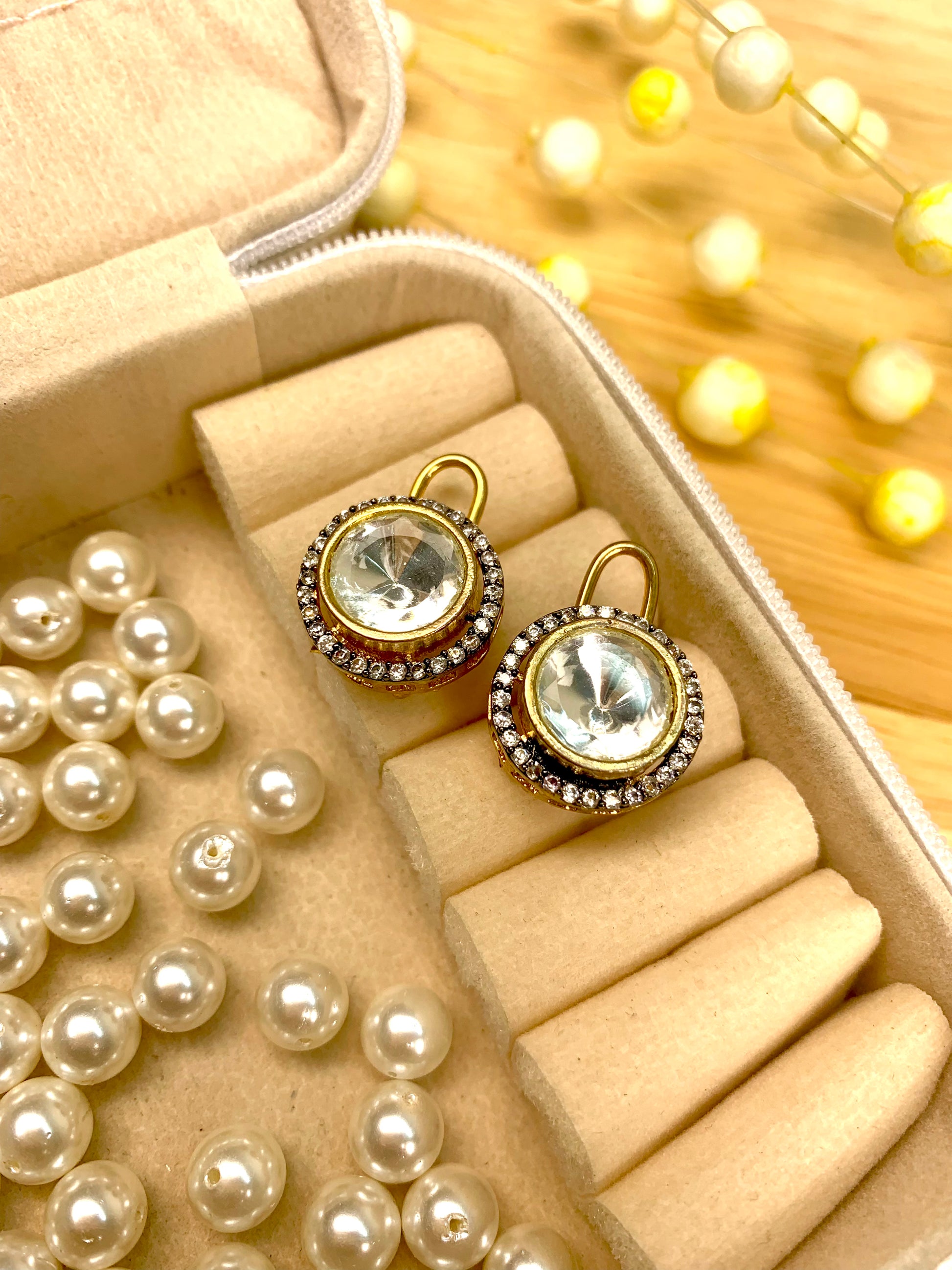 The Riyana Kundan Studs feature a polished round Kundan stone at the center, bordered with a halo of sparkling crystals. A timeless design that carries traditional elegance while remaining versatile for both festive and formal wear.