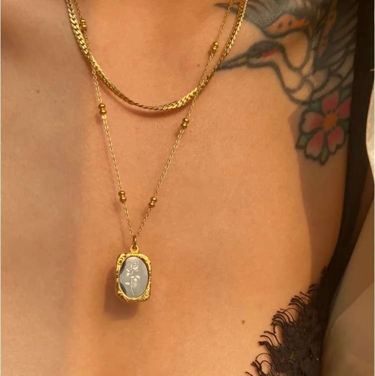 A symbol of timeless romance, The Rosalind Pendant features a delicate rose motif etched onto a polished enamel background, framed in radiant gold plating. Suspended from a dainty chain with beaded accents, it brings together vintage charm and modern elegance.