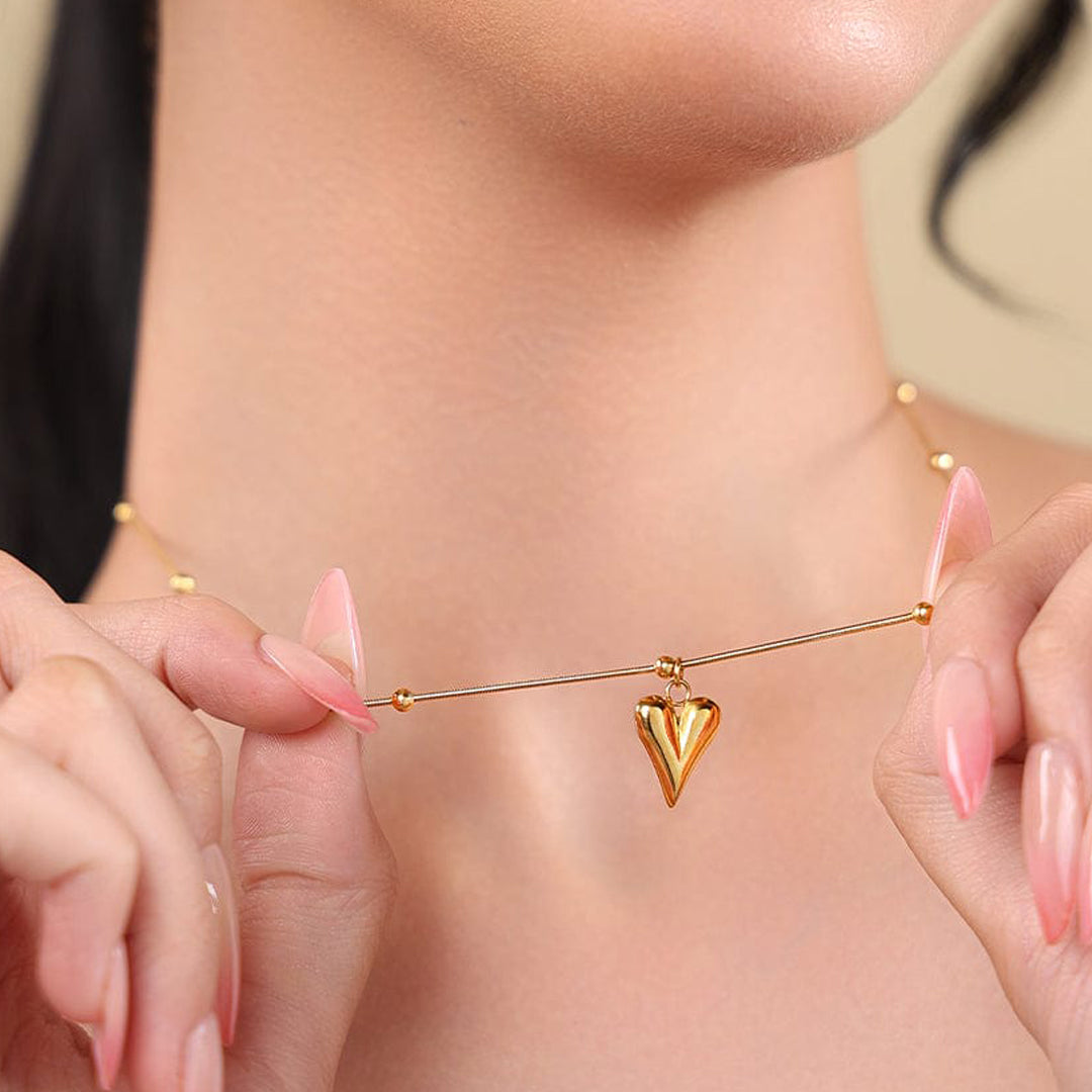 Delicate yet meaningful, The Serene Heart Necklace captures the essence of love in its purest form. Featuring a polished gold heart pendant suspended from a beaded chain, this piece blends minimalism with timeless romance.