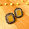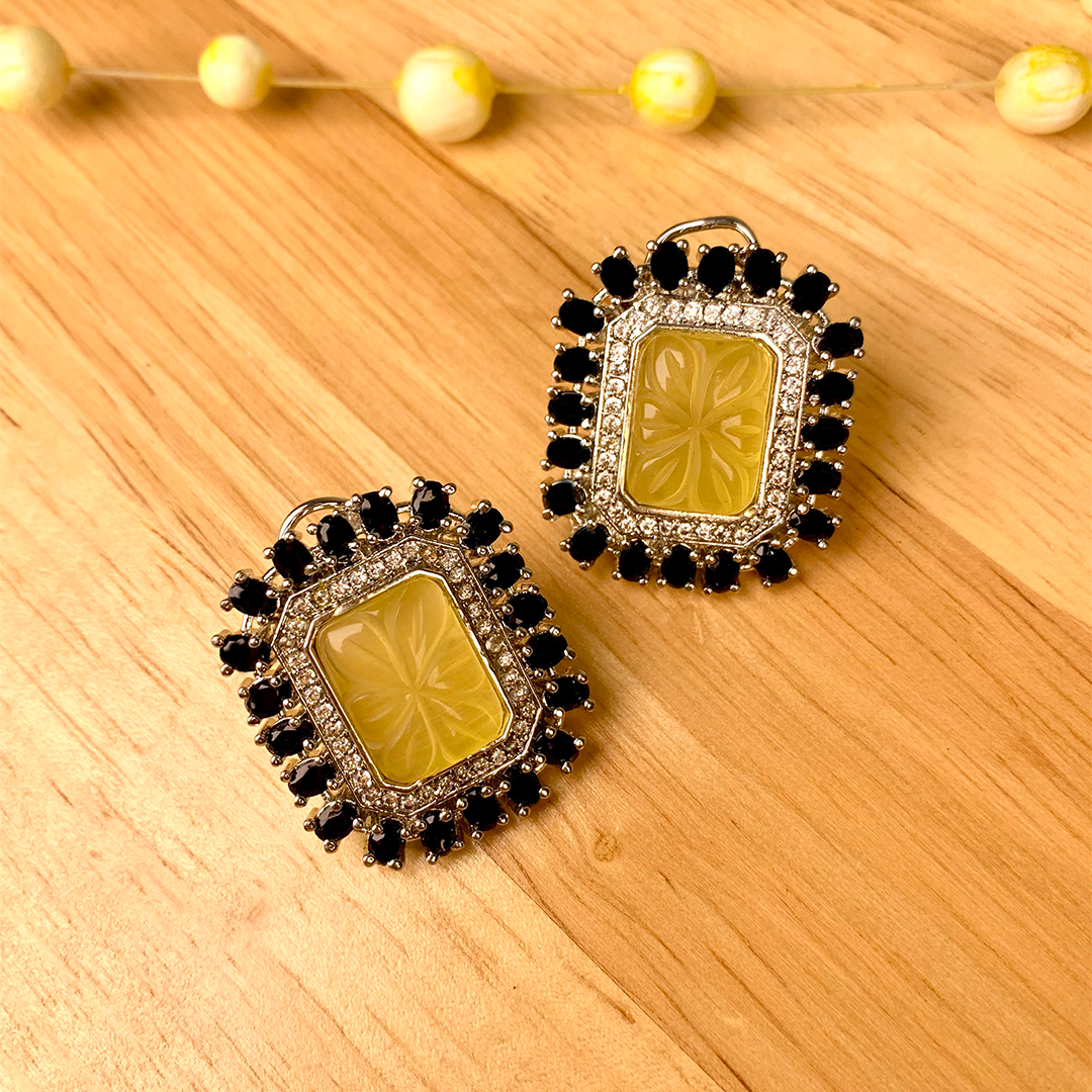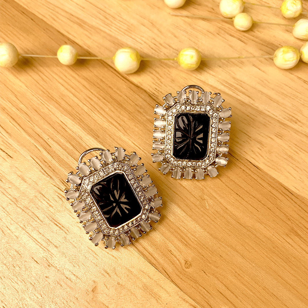 The Solara Radiance earrings feature a deep black carved stone framed with a halo of dazzling crystals. Bold yet graceful, they add a touch of mystery and sophistication to evening looks.