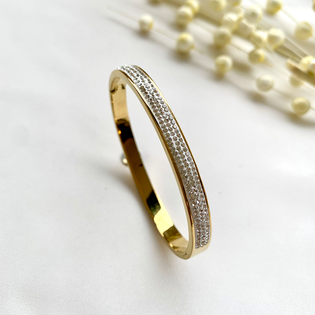 The Sorell Bracelet is crafted in a polished gold finish, elegantly lined with rows of fine white stones that create a dazzling shine. Its refined sparkle and timeless design make it a perfect choice for both daily elegance and special occasions.