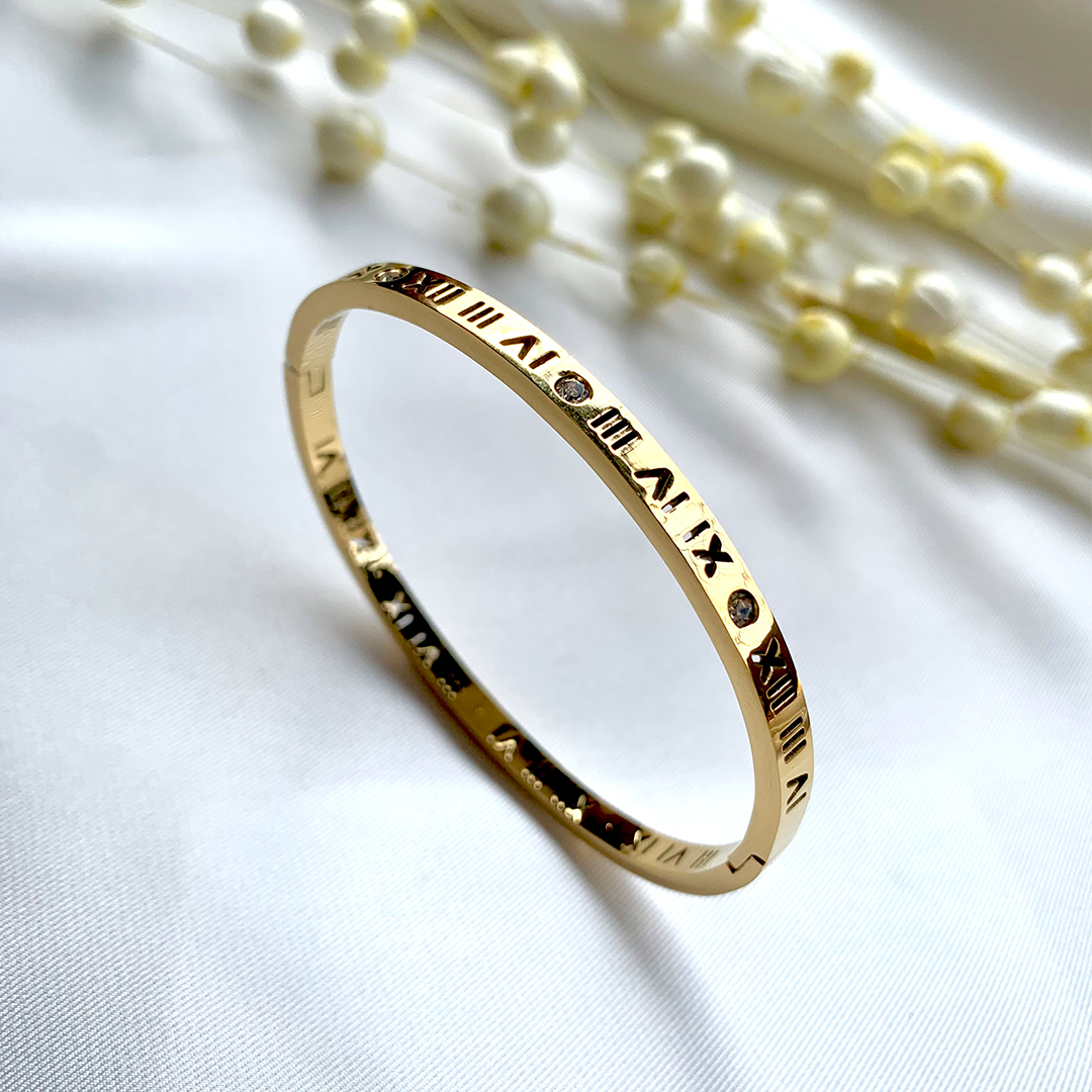 The Velin Bracelet is crafted in a polished gold finish, detailed with Roman numeral engravings and accented with fine sparkling stones. Its classic yet modern design makes it a meaningful piece, perfect for adding timeless elegance to any look.