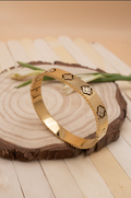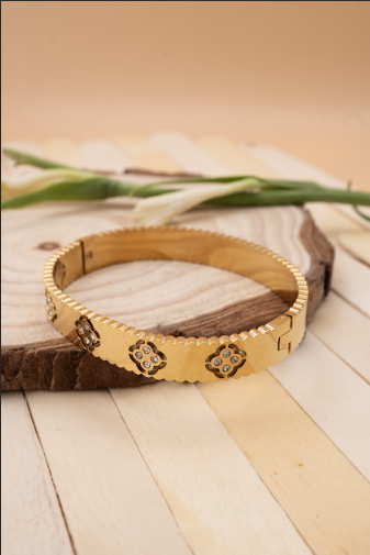 The Vera Bracelet blends subtle detailing with polished sophistication. Crafted from premium stainless steel and plated in radiant 18K gold, it features delicately engraved floral motifs accented with sparkling cubic zirconia. The textured edge design adds a distinctive touch, making it stand out while remaining timeless.